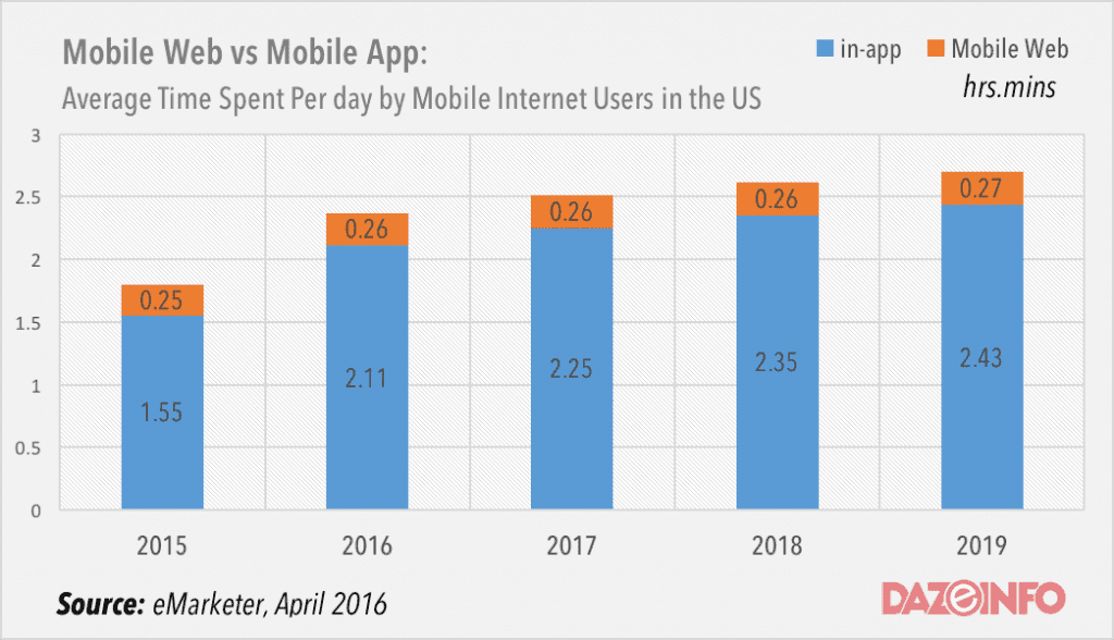 As the eMarketer chart (via dazeinfo) shows, consumers spend nearly all of their time in apps as opposed to mobile websites. Thus it just makes sense to put your design and development calories into your app first, and then port the work over to the mobile site. No matter how much Google’s spiders and robots want to crawl your website, your actual customers prefer an app when they’re on the go. Be sure to make the app experience great before anything else, and not the other way around.
