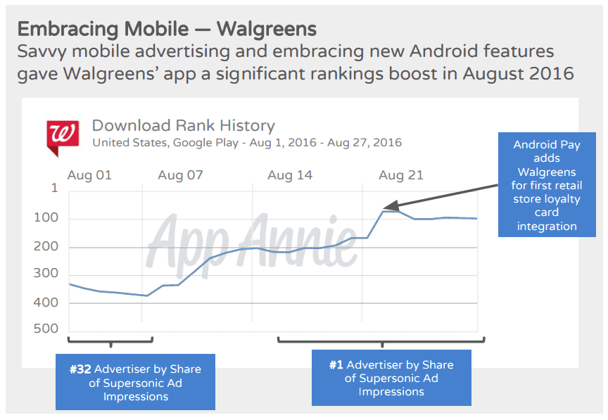 According to a report by AppAnnie, getting featured by either Google or Apple’s app store can increase downloads by up to 500%. Check out what they recently saw with Walgreens: