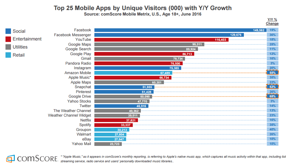 According to comScore’s 2016 US Mobile App Report, 49% of smartphone users downloaded no new apps in the last month. The data points to most people just using the same apps over and over again. Which apps? You can probably guess most of the top 25: